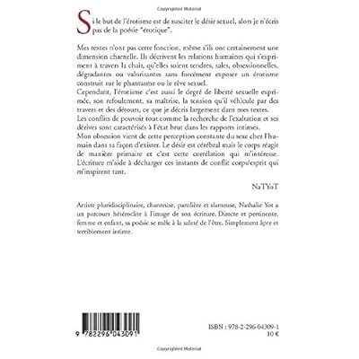 Si le but de l'érotisme est de susciter le désir sexuel, alors je n'écris pas de la poésie "érotique". Mes textes n'ont pas cette fonction, même s'ils ont certainement une dimension charnelle. Ils décrivent les relations humaines qui s'expriment à travers la chair, qu'elles soient tendres, sales obsessionnelles, dégradantes ou valorisantes sans forcément exposer un érotisme construit sur le phantasme ou le rêve sexuel.