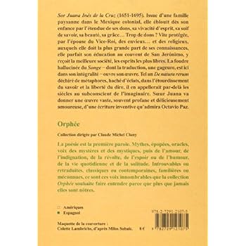 L'histoire de cette enfant d'une famille paysanne, née d'un père basque et d'une mère mexicaine, relève des miracles que la société politique ou religieuse pouvait parfois offrir en transgressant les codes et les inégalités. Dès son plus jeune âge, Juana Inès éblouit par l'étendue de ses dons et son goût de l'étude - elle apprend à lire à trois ans, étudie le latin sans professeur -, par l'étendue de sa curiosité, et bientôt par l'éclat de sa beauté. Aussi sa précocité confondante attire-t-elle l'attention de la Cour du Vice-roi : elle y trouve des appuis, et parfait son éducation au couvent de San Jerónimo. Qui plus est, elle s'adonne à des études diverses, notamment dans le domaine des sciences, excitant aussitôt la méfiance des autorités ecclésiastiques. Cet appétit de connaissances, son charme et sa culture font du couvent, où elle reçoit la meilleure société, ainsi que lettrés et savants autour de la gourmande cérémonie du chocolat à la mexicaine, un lieu raffiné. Son grand poème, Premier Songe, que nous donnons ici dans son intégralité, illustre le conceptisme, dans l'affrontement des métaphores, des éclats, des effets pour le moins inattendus des comparaisons, des évocations, l'étourdissement du savoir, le baroque échevelé - nous sommes au temps où Góngora l'impose, mais rigoureux et sévère, en Castille. L'inspiration du Songe en appelle à la fois à Lucrèce comme, par-delà les siècles, au fantastique surréaliste ! Une gageure de traduction tenue haut la main par Jean-Luc Lacarrière. Auteur de théâtre, passionnée de musique, étourdissante de savoir, elle écrit ensuite des poèmes de forme classique, d'une perfection et d'une liberté d'inspiration souvent profane et délicieusement amoureuse, qu'admira Octavio Paz. Puis, Sor Juana Inès tomba dans une sorte de renoncement à tout, avant de mourir, avec la plupart de ses compagnes, lorsque Mexico fut frappé par une épidémie de peste.