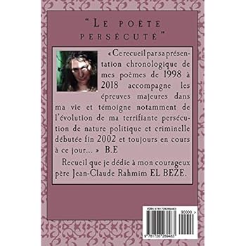 (Lire l'AVERTISSEMENT important qui suit !) « Ce recueil (actualisé depuis sa publication) appelé " le poète persécuté" et dédié à mon courageux père, Jean Claude Rahmim EL BEZE, décédé en 2013, par sa présentation chronologique actualisée de mes 79 poèmes de 1998 à fin 2019 accompagne les épreuves majeures dans ma vie et témoigne notamment de l’évolution de ma terrifiante persécution de nature politique et criminelle débutée fin 2002, menée sur mon père aussi dès 2006, et toujours en cours à ce jour et pire que jamais "... AVERTISSEMENT!!! : EN RAISON DE MON ANTISIONISME IL Y A UNE TRES GRAVE DIFFAMATION ORCHESTREE SUR CONSIGNES DU LOBBY CONTRE MON PERE ET MOI VIA UN TROLL JUDEONAZISIONISTE EN MISSION ( QUI PREND PLUSIEURS PSEUDOS) .. ET FAIT DES FAUX COMMENTAIRES DE NON ACHETEURS (avec graves diffamations ( de soidisant folie, plagiat , inceste, état suicidaire etc..) et obscénités répugnantes en sous commentaires telles " va faire éjaculer Papounet ignoble putain ..etc ) ) .. et DEPUIS NOV 2019, FAIT AUSSI DES FAUX COMMENTAIRES DELIRANTS FABRIQUÉS ELECTRONIQUEMENT AVEC USURPATION DE MON IDENTITÉ !!!! (= mon nom "Béatrice EL BEZE" mis en bleu pour faire croire que c'est moi qui les ai écrits!!)!= grave délit au regard de la loi = faux et usage de faux avec la complicité d'Amazon (= le lobby judéonazisioniste ) QUI REFUSE ILLEGALEMENT D ELES SUPPRIMER !!, BIEN QU'INFORMÉ ! et, malgré mes demandes répétées ! .. Ces "saloperies" illégales sur ma page de vente , sont faites pour dissuader et effrayer les potentiels acheteurs de mon recueil et cacher mon talent, car les criminels du lobby ont peur que mon talent fasse connaitre ma persécution ..(mais il n'arrive rien aux acheteurs , rassurez vous. ! Amazon ne met pas non plus la nouvelle version des couvertures !!! de mon livre et bafoue gravement tous mes droits d'auteur et en me vole des redevances en ne me notifiant pas nombre de ventes !, ) , JE RESTE NEANMOINS SUR AMAZON SINON MON RECEUIL N 'EXISTERA NULLE PART EN CONTEXTE DES METHODES DANS MA PERSECUTION et vu les pressions faites sur les maisons d'édition qui voulaient méditer ,….. ( Pour comprendre lire le seul commentaire de moi , =celui qui es très long avec un''avertissement important aux lecteurs' comportant aussi 2 poèmes de moi à la fin ( le retour de la b^^et immonde et " Tout n'est que sentiment" ) ..je 'lai mis en sous commentaire sous tous les commentaires .. (tous les autres commentaires faits à mon nom sont des faux!!! ".. Appelez moi directement sur mon port: 0660839079, après 15h (car certains sms ne me parviennent pas), pour me donner uniquement votre numéro et date de commande et le numéro du quote barre sur la dernière page) sinon Amazon me vole mes redevances ! mais je rappelle que JE NAI BESOIN NI DE VOTRE NUMERO DE TEL NI DE VOTRE VOTRE NOM NI D E RIEN D 'AUTRE ! contrairement aux saloperies qu'écrit le troll du lobby en commentaires avec usurpation d e mon identité sur ma page de vente pour dissuader et effrayer les acheteurs , et je el redis IL NARRIVE RIEN AUX ACHETEURS DE MON RECUEIL RASSUREZ VOUS ! /IMPORTANT ! je rappelle aussi que je ne suis absolument PAS SUICIDAIRE et ne l’ai jamais été! contrairement à ce que font croire ces criminels judéonazisionistes, via leur troll , qui aimeraient bien me suicider !!!. / *Voici le Lien ( copiez collez le ) vers les documents preuves dans ma terrible persécution ) http://beatrice-el.beze.over-blog.net.over-blog.com/article-b-el-beze-quelques-documents-preuves-de-mon-affaire-125145562.html et pour comprednre toute laffaire , voici ci après le lien d e ma vidéo du 9/12/19 intitulée " RÉSUMÉ(et preuves) DE MA TERRIFIANTE PERSECUTION DE 2002 à fin 2019 , PIRE QUE JAMAIS " (copiez collez le ) : https://youtu.be/mEYNyeXFrI4 Merci. aux acheteurs / me joindre directement ; 0660839079 , après 15h ) Béatrice EL BEZE/ 28 déc 2019